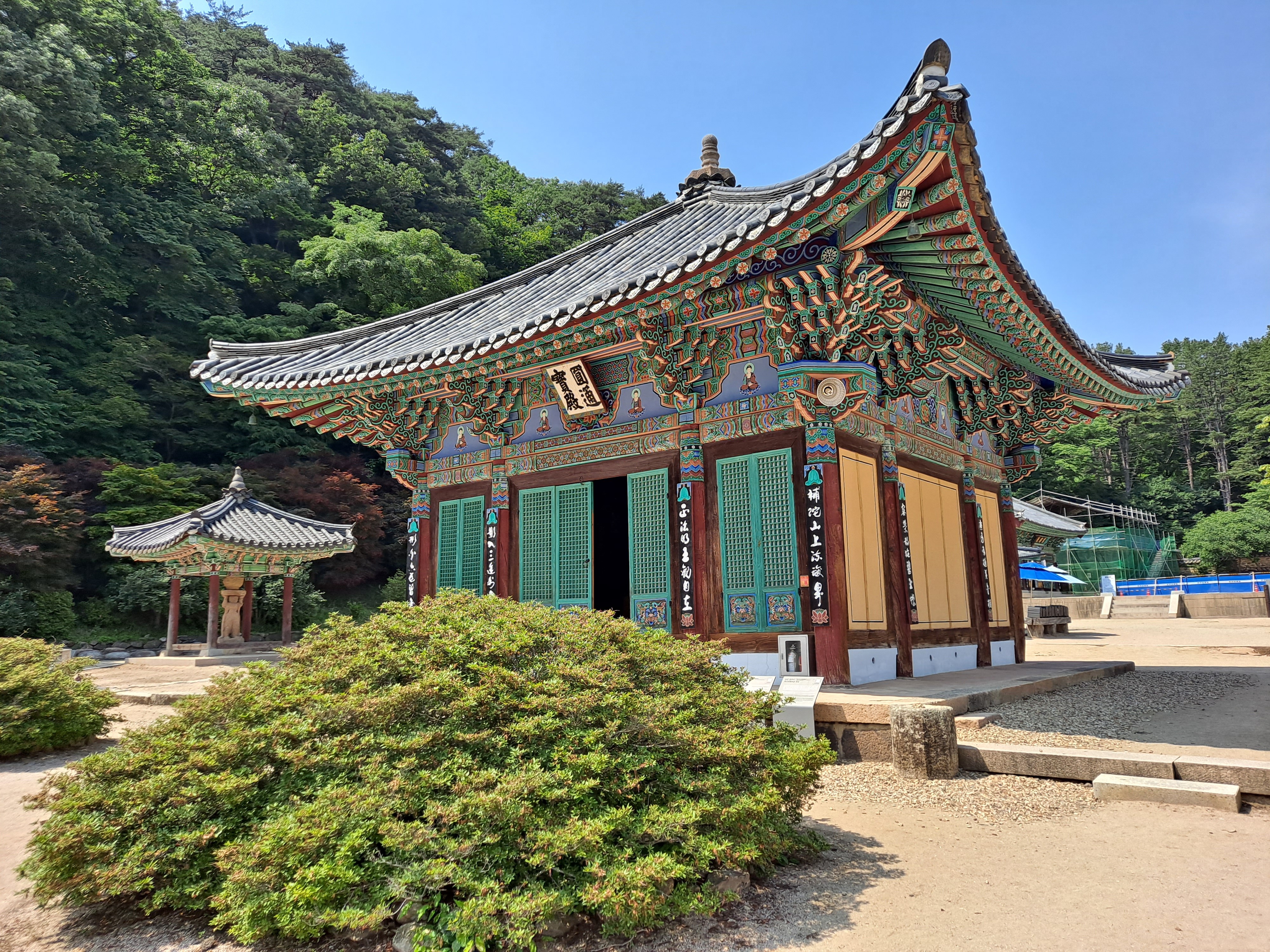 Wontongbojeon Hall is a single-story building, measuring three kan (unit of measurement referring to the distance between two columns) at the front and three kan at the side and having a square hipped roof. Brackets are installed only atop the columns to support the eaves of the roof. The Wooden Seated Avalokitesvara Bodhisattva (Treasure No. 1361) is enshrined in this hall. This 2.8-m high statue has an ornamental crown on its head and wears a benign smile on its face.