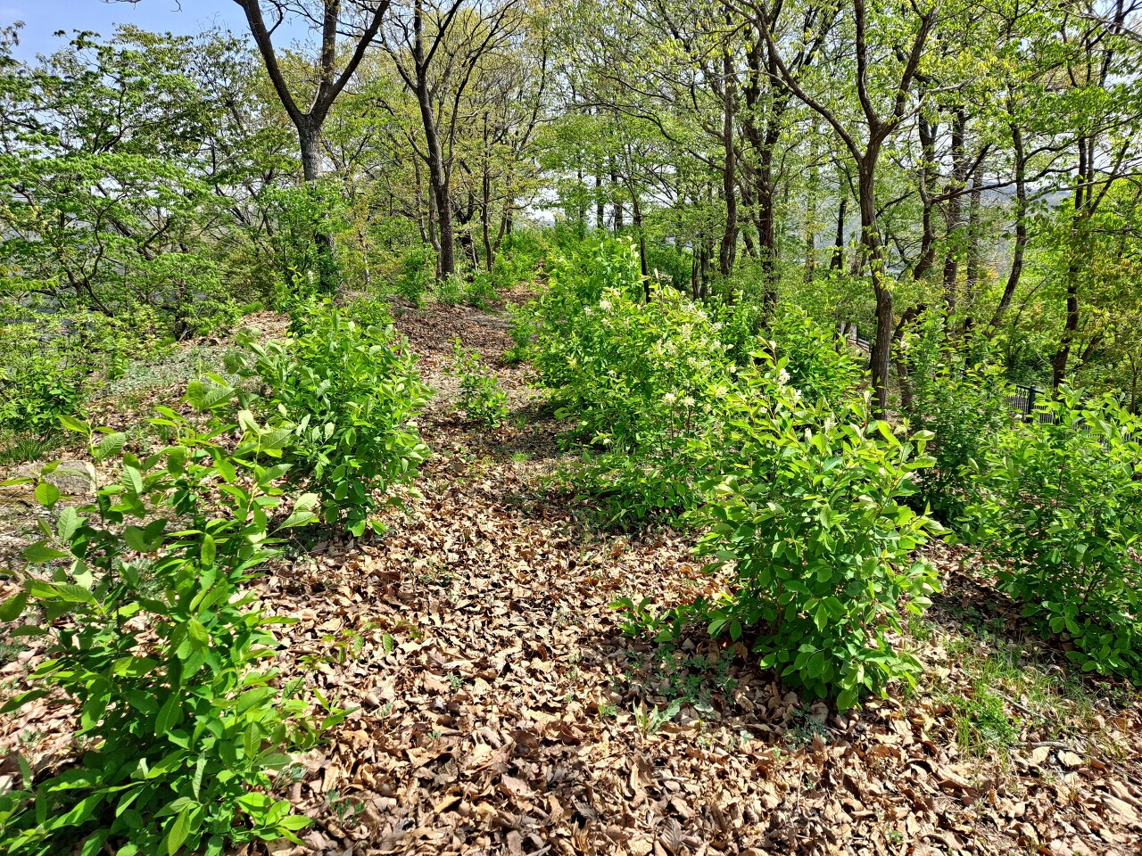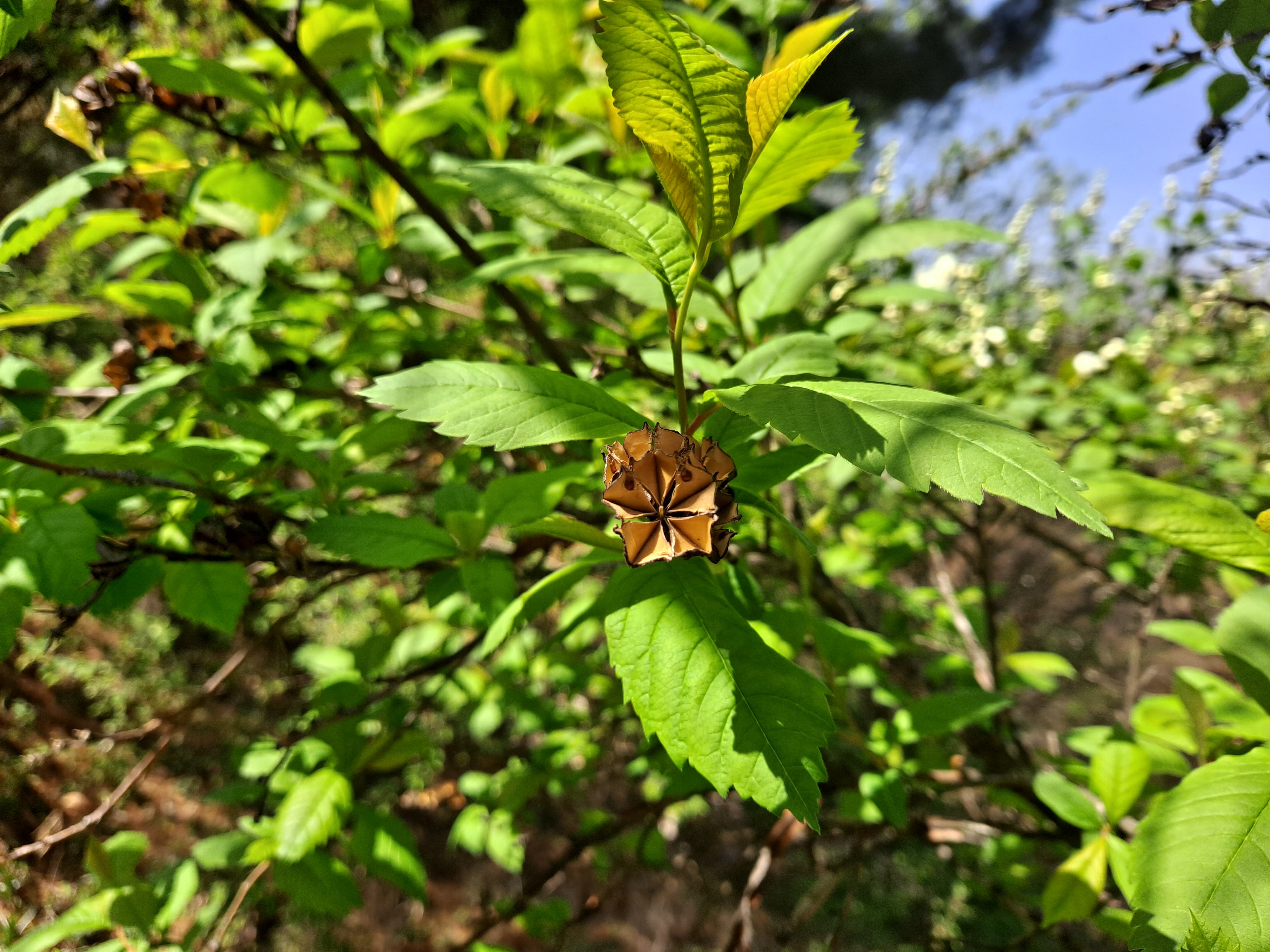 가침박달 군락을 알리는 표지판 부근엔 제법 키 크고 오래돼 보이는 가침박달도 보였다. 적갈색 가지에는 녹색 잎과 순백을 숨긴 꽃망울이 가득 달려 있었다. 아직 흰색의 꽃은 피지 않았다.