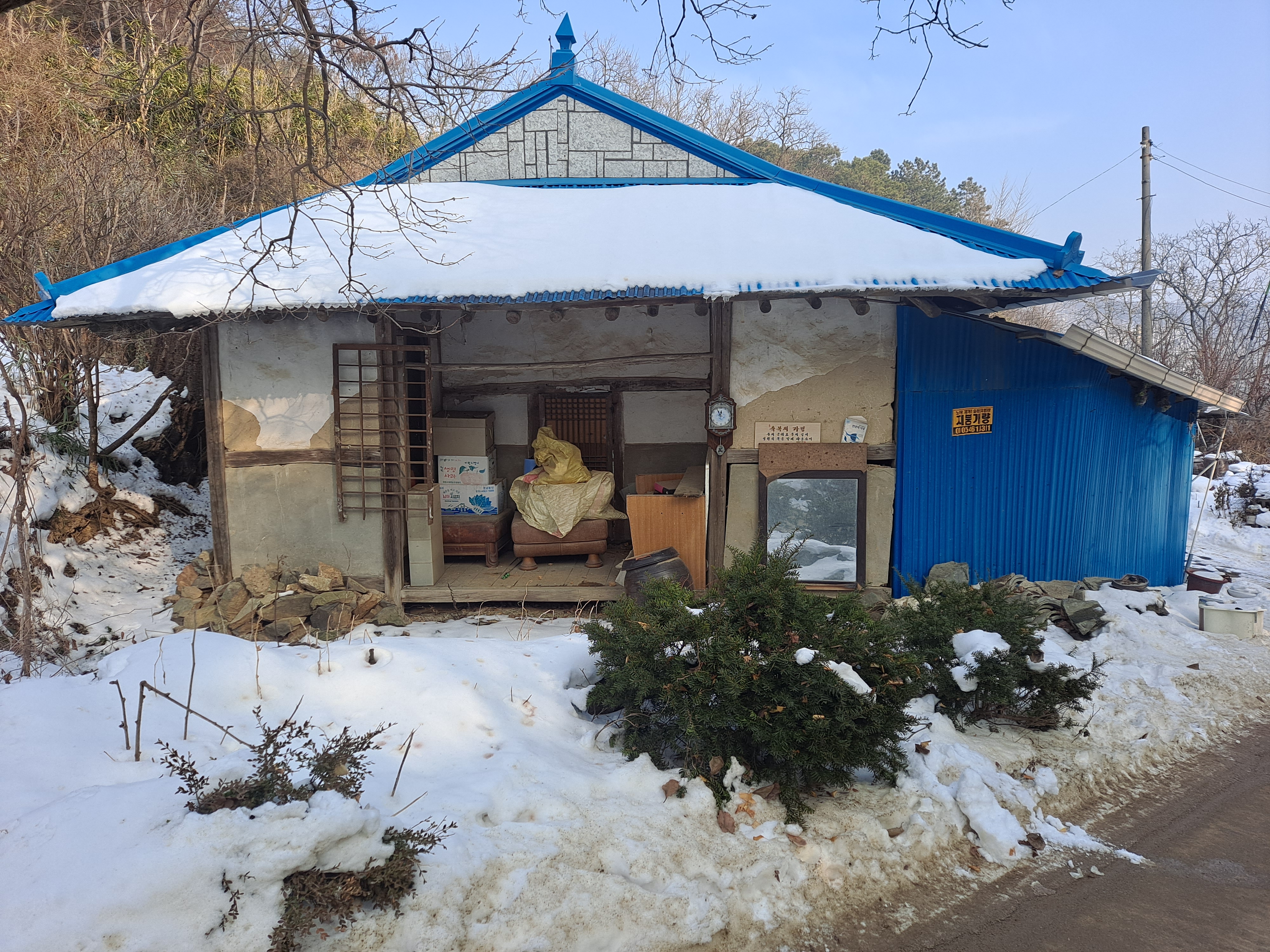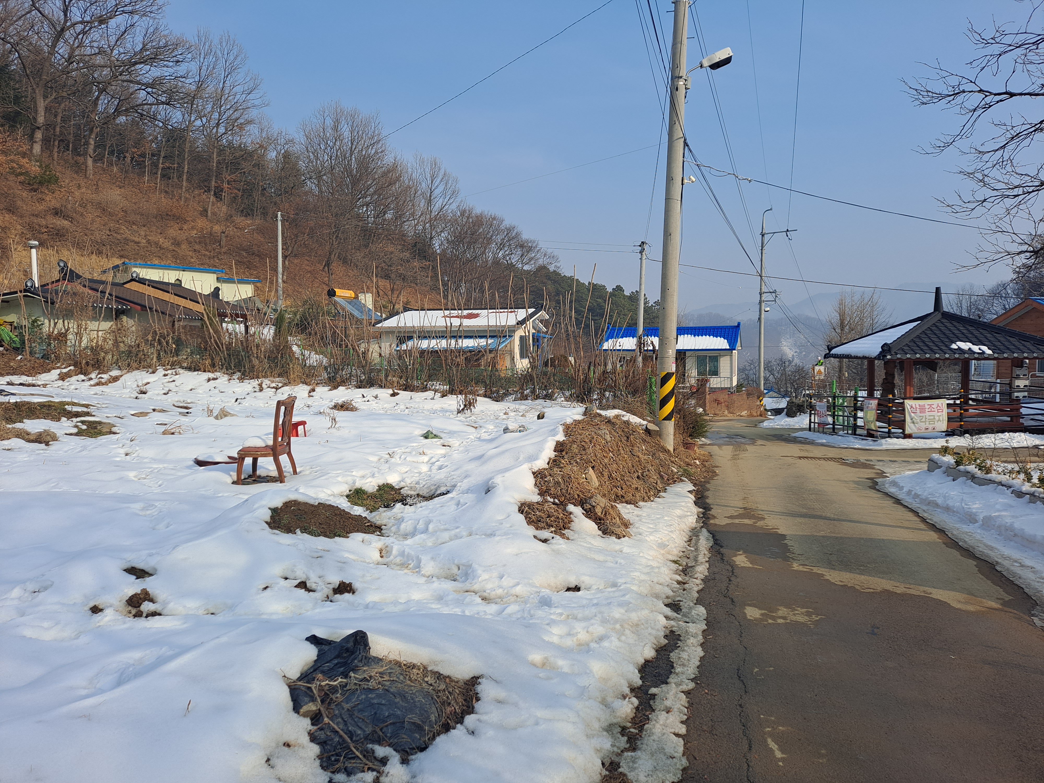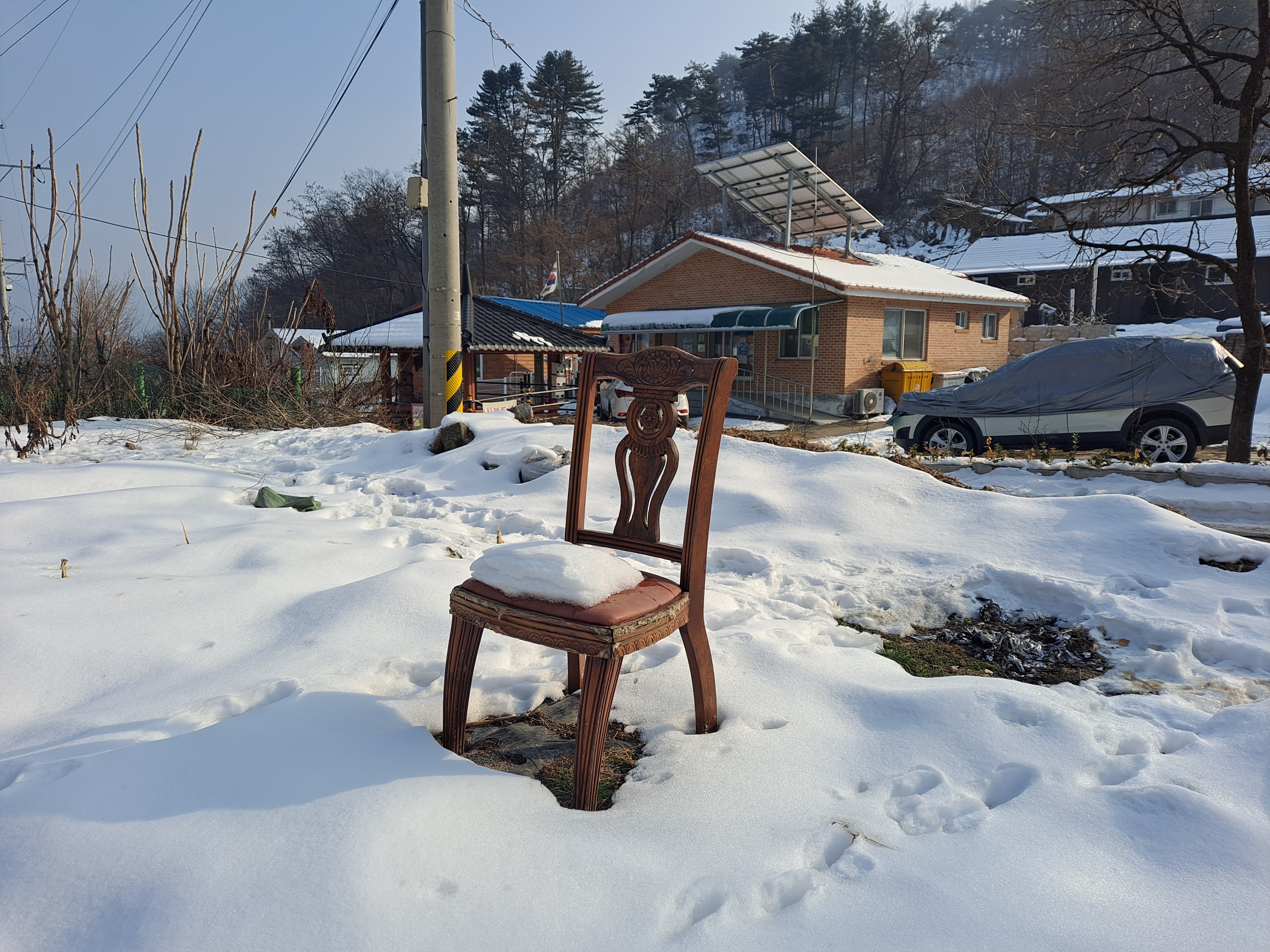 눈 덮인 산정말엔 아담한 집들이 자리잡고 있다. 텃밭 의자에 사람 대신 눈이 내려앉았다.