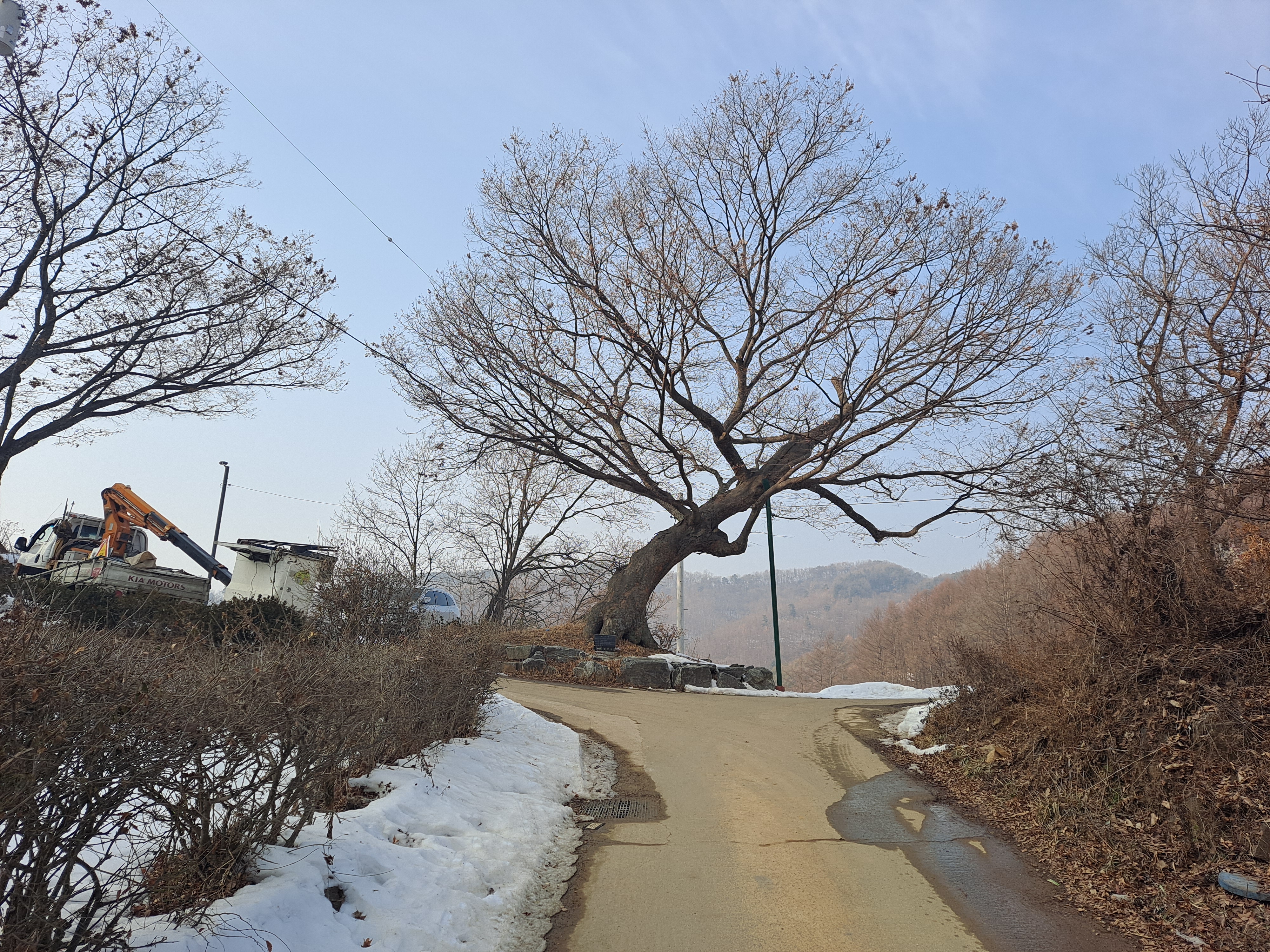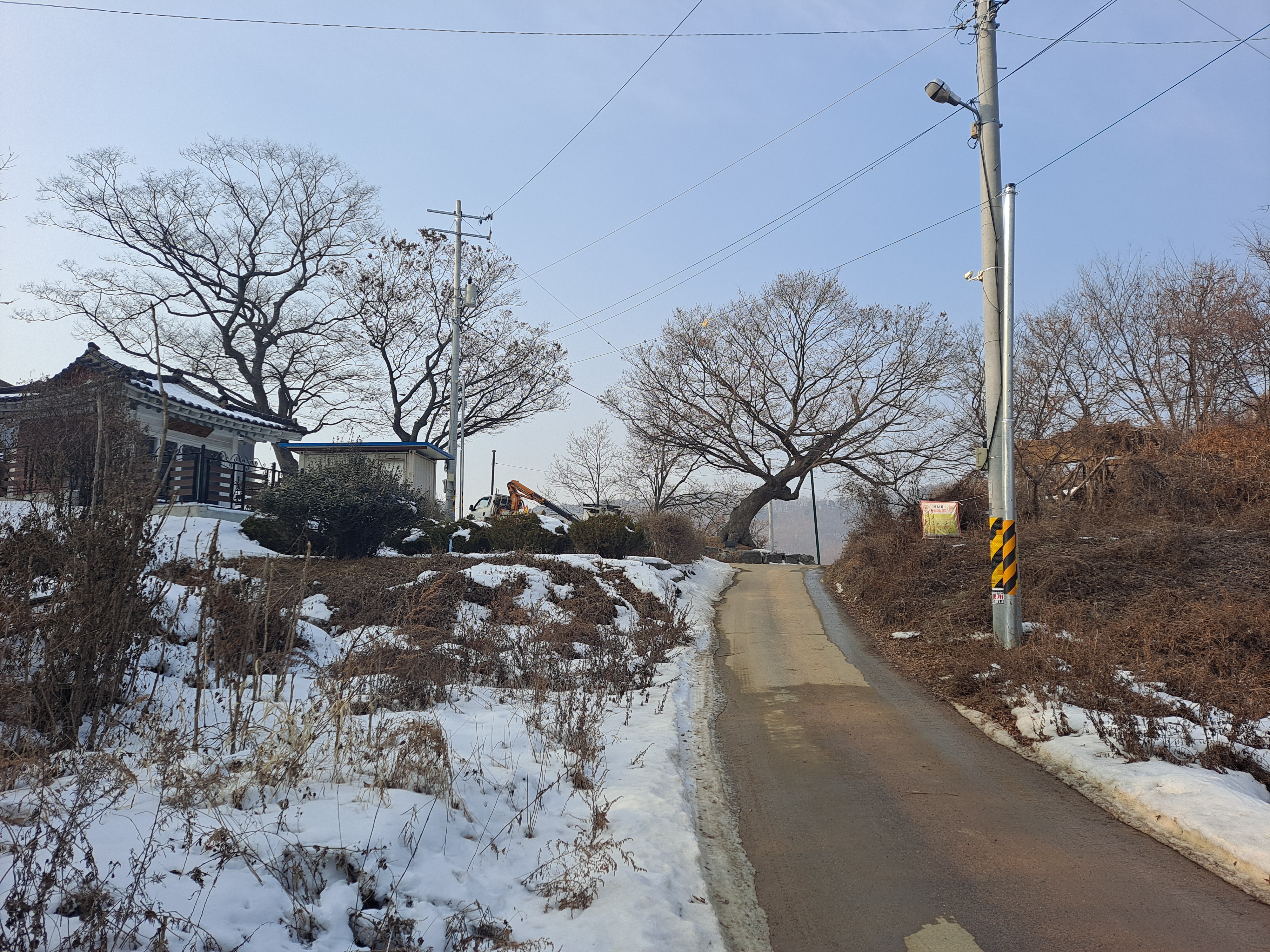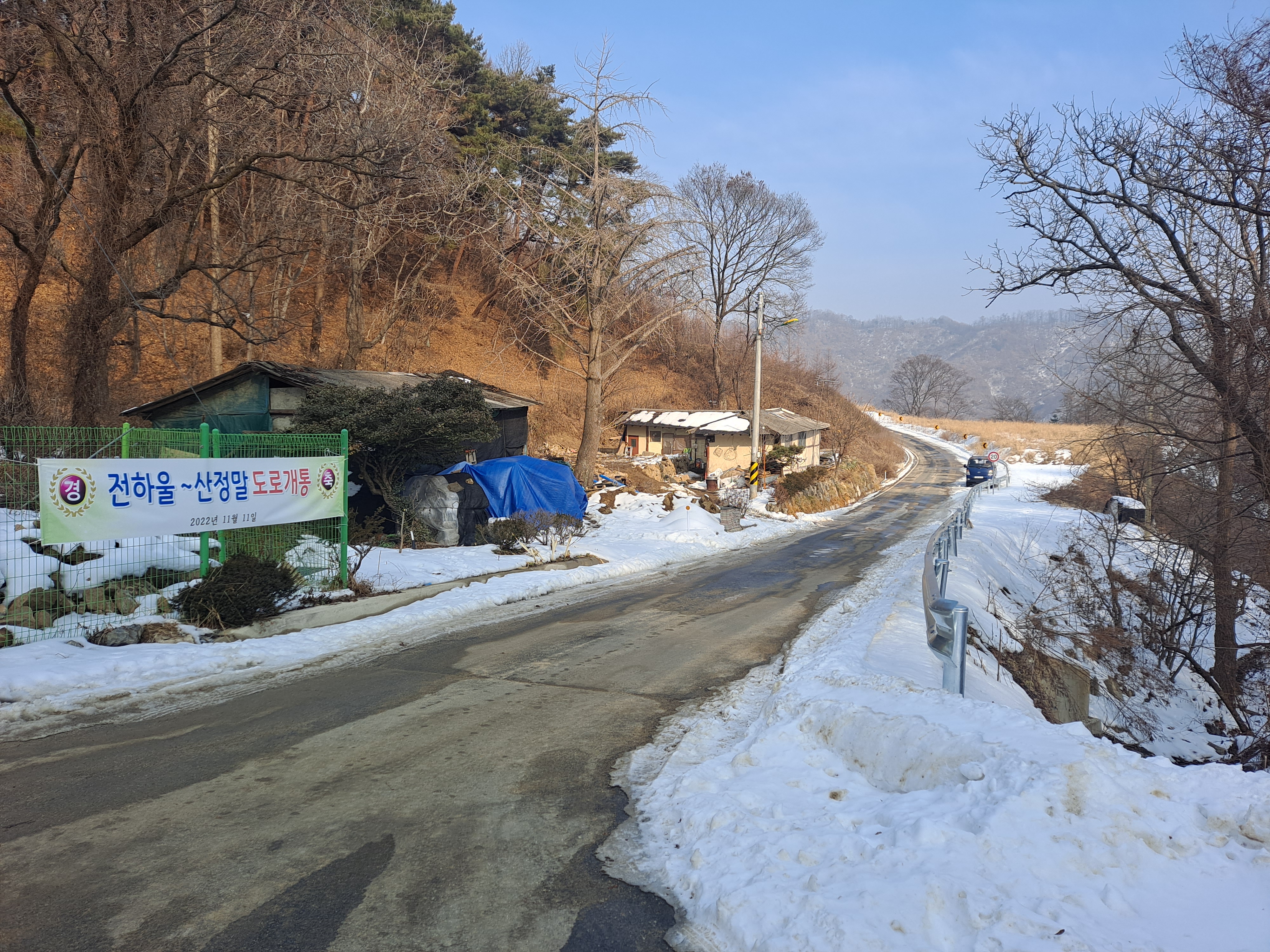 갈림길에서 좌측은 산정말로 가는 길이고 우측은 전하울로 가는 길이다. 2022년 11월 개통된 "전하울-산정말 도로개통" 플래카드가 보인다.
