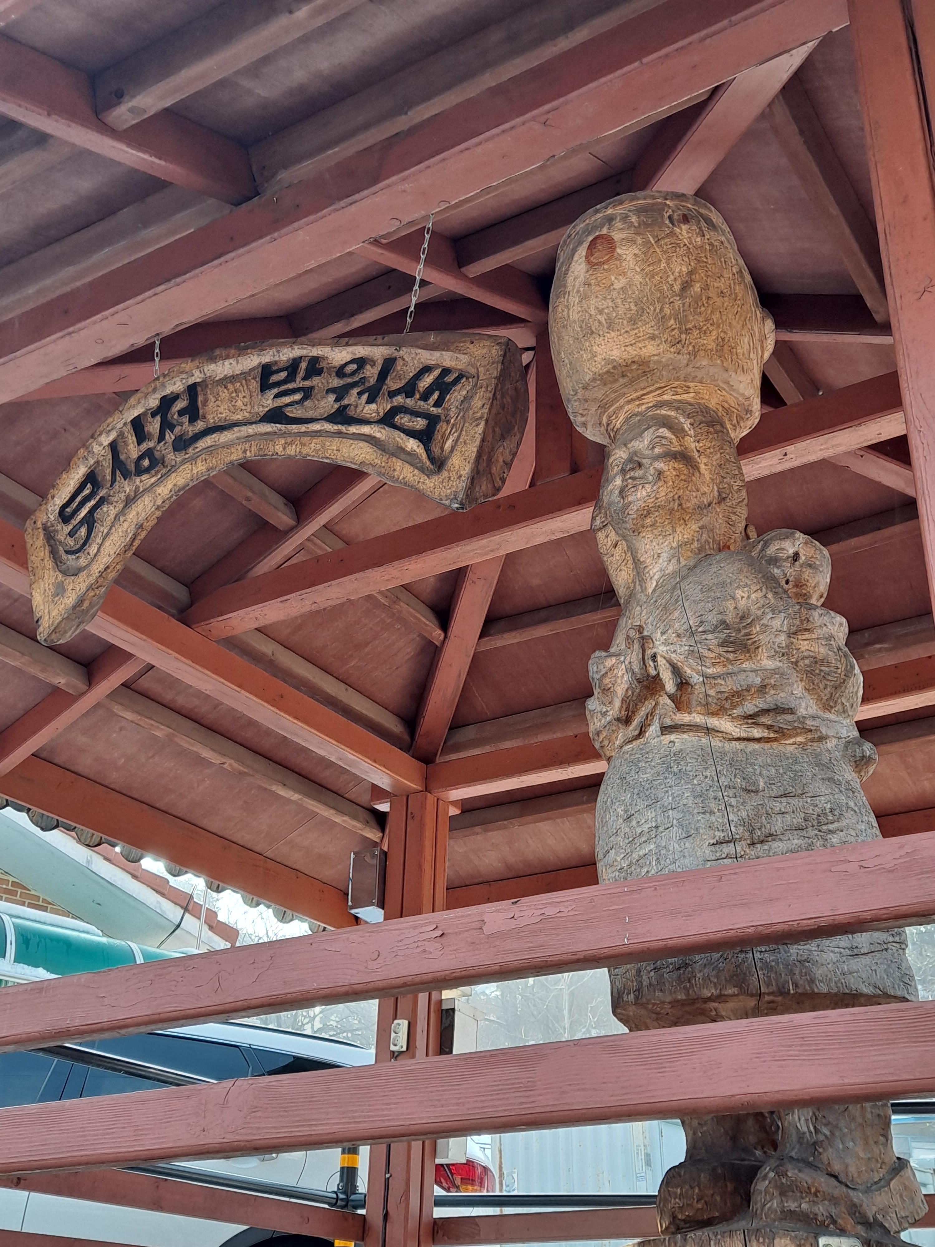 산정말 윗샘 정자엔 '무심천 발원샘'이라 쓴 나무푯말과 아이를 등에 업고 물동이를 머리에 인 여인상이 조각되어 있다.
