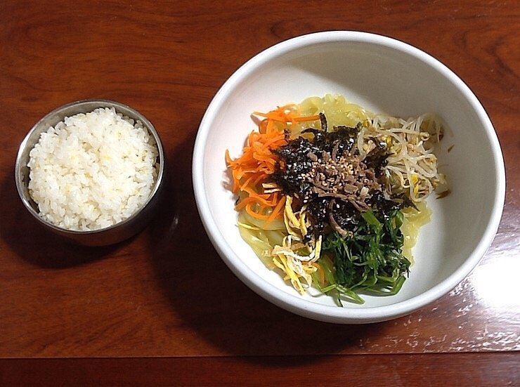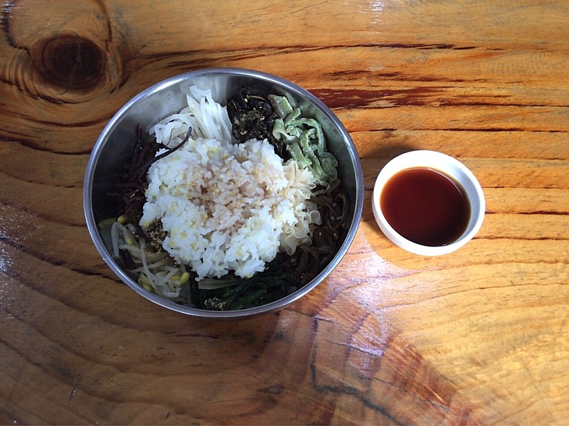 비빔밥용 나물은 대접에 따로 담아 내준다. 고사리나물, 무나물, 콩나물, 시금치 무침 등 기본으로 담긴 나물에 찬으로 나온 궁채 나물무침, 말린 가지나물 무침, 아주까리 무침, 흰목이버섯 무침 등을 더한다. 나물별로 삼삼하게 양념이 되었다. 조를 섞어 지은 부드러운 쌀밥과 깊은 짠맛과 은은한 단맛이 어우러진 조선간장을 넣어 골고루 비빈다. 식재료의 다양한 식감과 색감, 맛이 한데 어우러져 한층 풍미를 더하는 산뜻한 비빔밥이다.