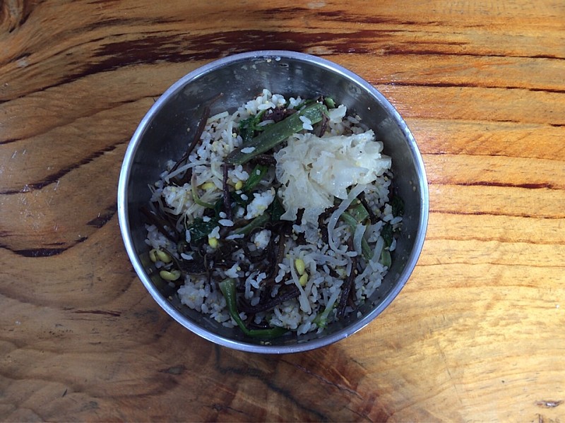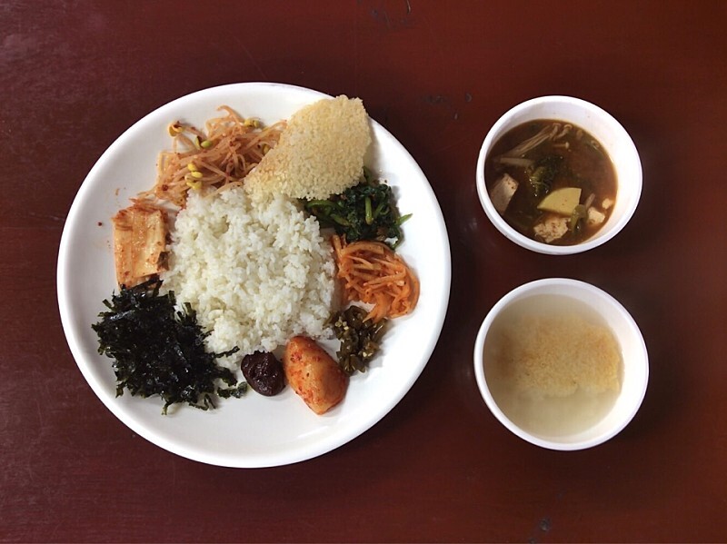 용문사 답사 후 점심 식사 공양을 한다. 하얀 접시 중간에 고슬고슬하고 따뜻한 쌀밥을 담고 콩나물무침, 고독고독 씹히는 구수한 누룽지, 아삭한 식감의 짭짤하고 시금한 김치, 김 가루, 매콤하고 짭짤한 찰진 고추장, 단단하고 아삭한 총각무, 새곰하고 칼칼한 고추지, 무생채, 된장 넣어 버무린 나물무침 등 밑반찬을 조금씩 빙 둘러 담는다. 냉이, 달래, 감자, 두부, 버섯 등을 넣어 끓인 구뜰하고 담백한 된장국을 곁들여 먹는다.