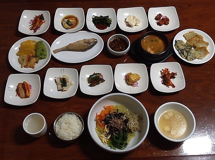양념 고추장으로 무친 명태포 무침, 달걀장조림, 미역 초장, 샐러드, 건두부조림, 사각사각 씹히는 상큼한 사과 맛의 사과튀김, 고추튀김, 꼬치, 비빔용 짠 양념간장, 된장찌개, 부드러운 파전, 삼동초, 당근, 부추, 숙주나물 등을 넣은 고소한 녹두전, 김치, 된장 고추 무침, 고구마 맛탕, 도라지무침 등 밑반찬과 알맞게 구워진 조기구이 반찬이 정갈하게 차려진다. 허투루 만들지 않은 손이 많이 간 밥상이다.