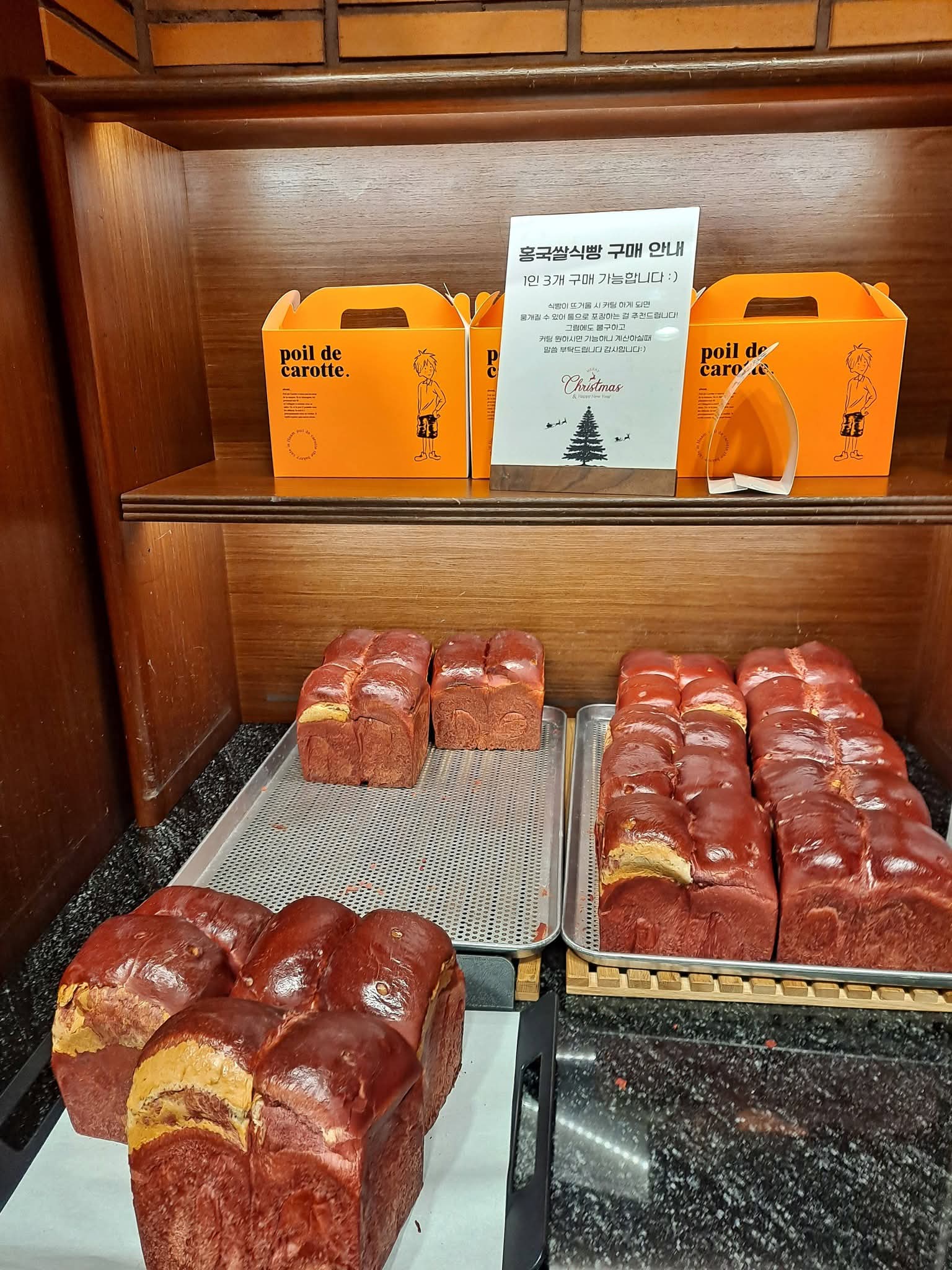 붉은색 홍국쌀식빵은 시그니처 빵이다. 입소문이 많이 나서 빵 나오는 시간엔 줄을 서야 한다. 1인 3개만 살 수 있다.